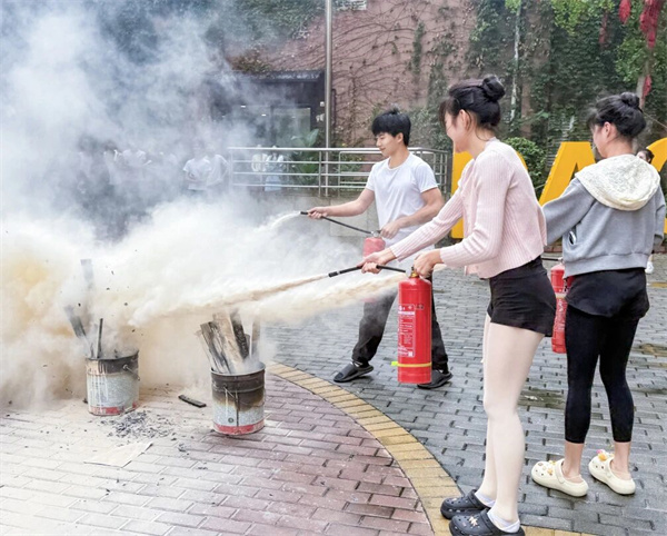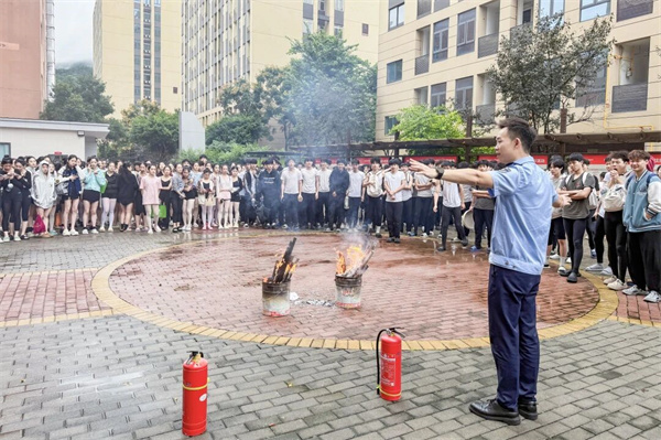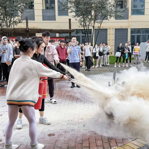 疏散演练结束后,活动进入灭火器材实践操作环节。韩教官首先向师生们介绍了灭火器的构造、工作原理、操作步骤及注意事项。在专业人员的示范和严密保护下,学生代表们分批靠近模拟火点,成功将火扑灭,实现了从“理论知识”到“实战能力”的跨越。