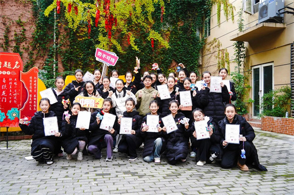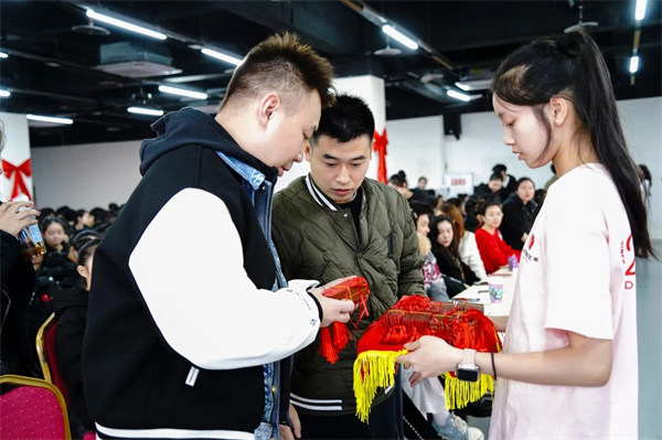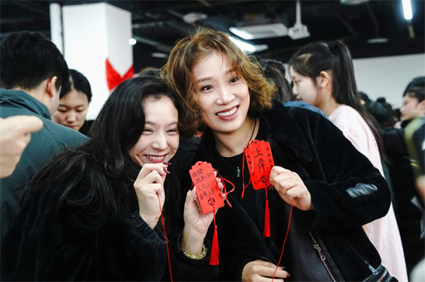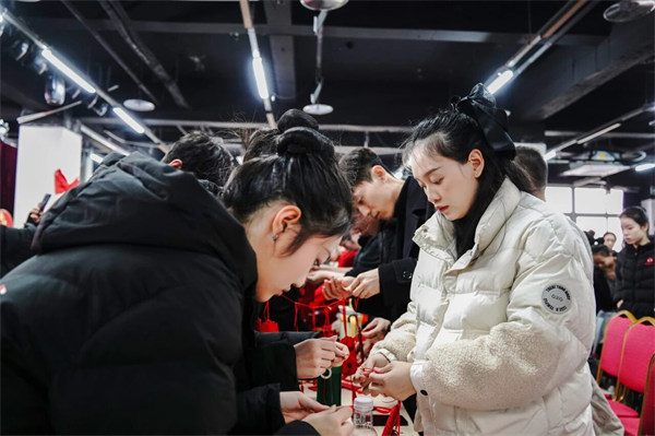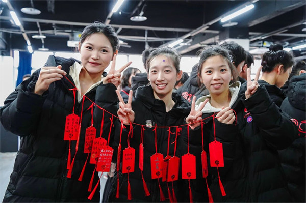 ▲师生们将祈愿牌穿上红绳